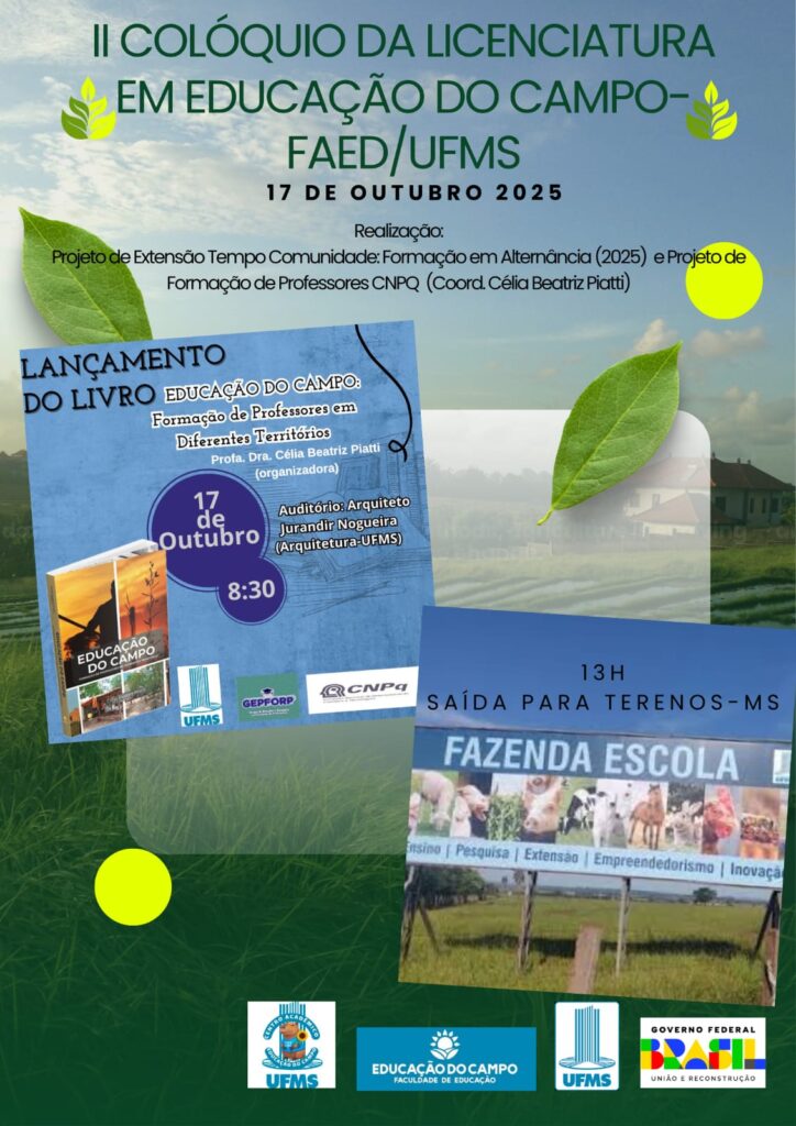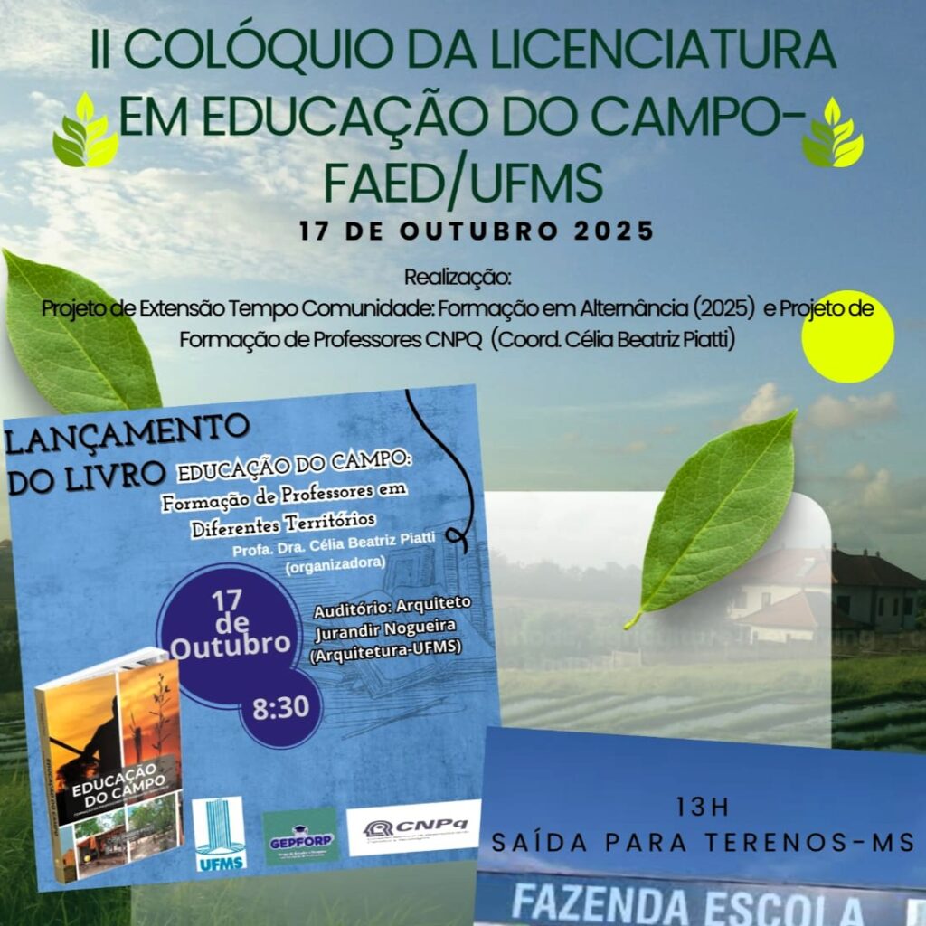 A Faculdade de Educação (Faed) da Universidade Federal de Mato Grosso do Sul (UFMS) promove, no dia 17 de outubro de 2025, o II Colóquio da Licenciatura em Educação do Campo. O evento é uma iniciativa dos projetos Tempo Comunidade: Formação em Alternância (2025) e Formação de Professores CNPq, sob coordenação da professora Célia Beatriz Piatti.