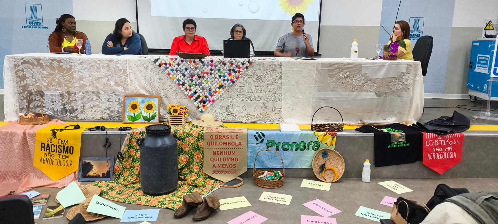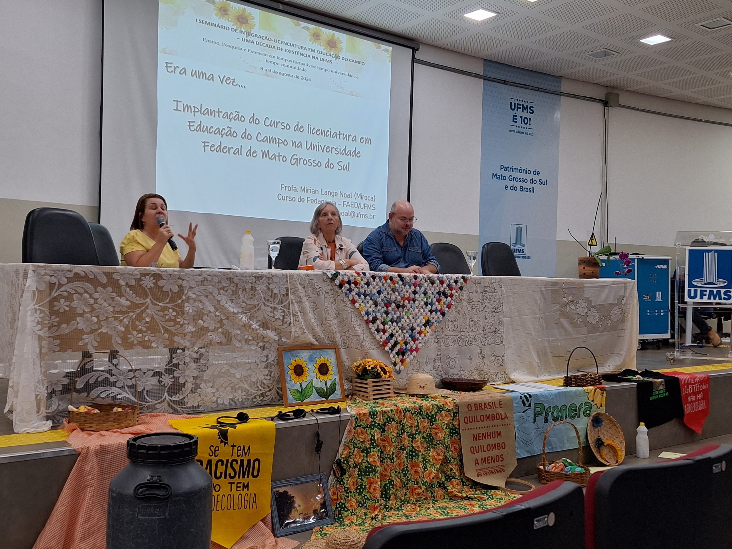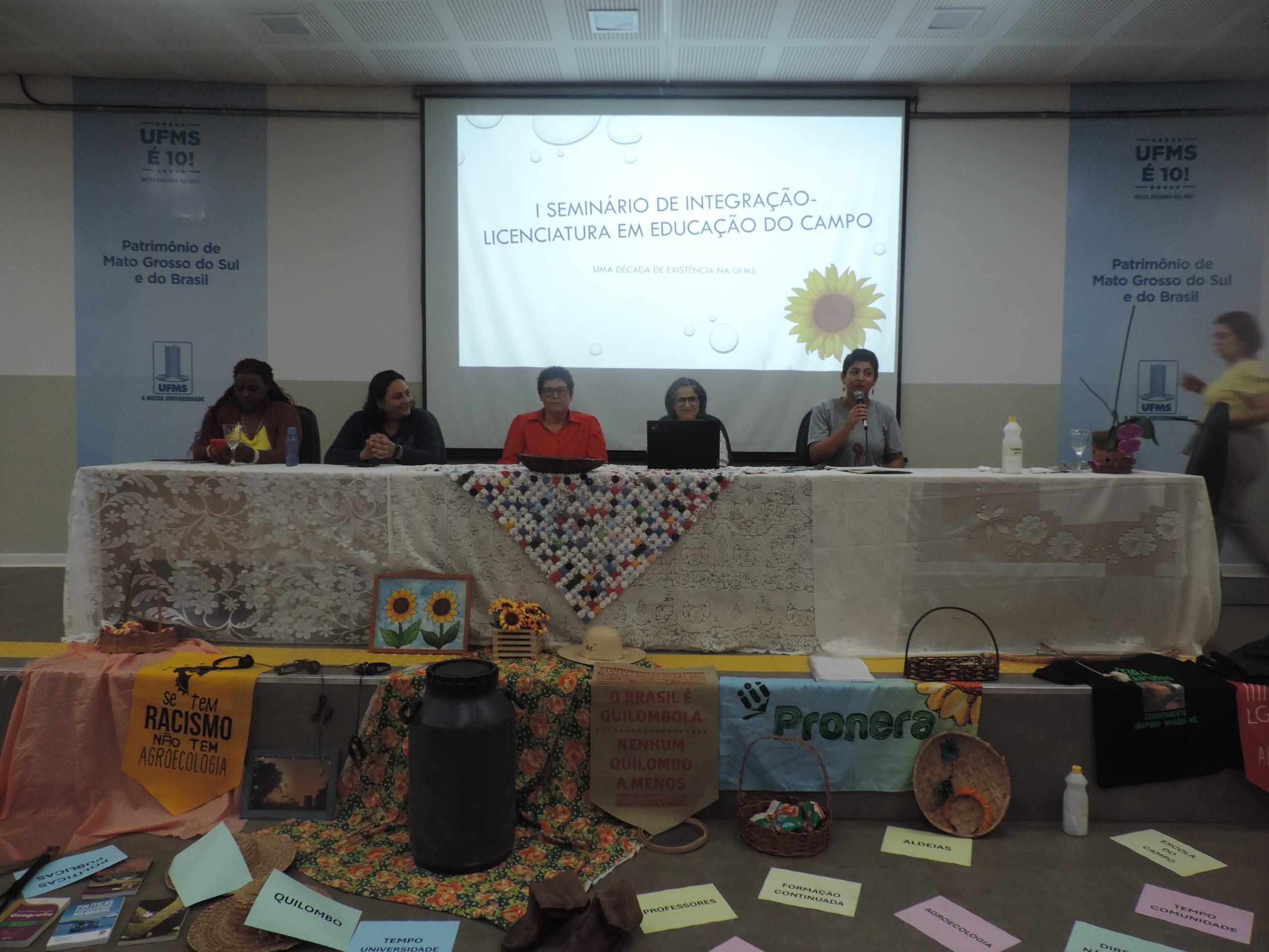 A Cidade Universitária sediou nos dias 8 e 9 de agosto, o 1º Seminário de Integração Licenciatura em Educação do Campo: uma década de existência na UFMS. Além da celebração ao aniversário do curso, o evento propôs reflexões sobre o tema Ensino, Pesquisa e Extensão em tempos formativos: tempo Universidade e tempo comunidade. Participaram do encontro professores, egressos e estudantes da licenciatura e também do curso de Aperfeiçoamento do Escola da Terra.